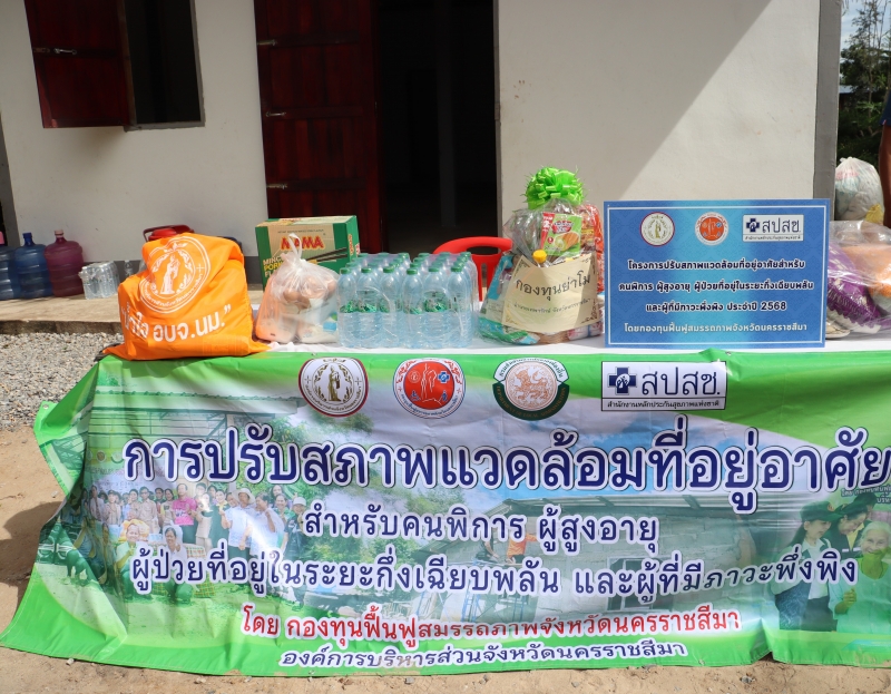 วันที่ ๒๔ กันยายน ๒๕๖๘ นายวีระชาติ ทุ่งไพแหลม รองนายกองค์การบริหารส่วนจังหวัดนครราชสีมา พร้อมเจ้าหน้าที่ ในนามกองทุนฟื้นฟูสมรรถภาพจังหวัดนครราชสีมา นายสุนา วงษ์ละคร ปลัดอำเภอเทพารักษ์ นายชาญชาย ศรีจันทึก สมาชิกสภาจังหวัดนครราชสีมา นายชาญชัย ศรีวิพัฒน์ นายกองค์การบริหารส่วนตำบลสำนักตะคร้อ นางสาวสิรภัทร สวัสดิ์นที ปลัดองค์การบริหารส่วนตำบลสำนักตะคร้อ พร้อมคณะ และผู้นำหมู่บ้าน อสม. ในพื้นที่ ได้ร่วมติดตามประเมินผลกลุ่มเป้าหมายพร้อมส่งมอบบ้านคนพิการ ผู้สูงอายุ ผู้ป่วยที่อยู่ในระยะกึ่งเฉียบพลันและผู้ที่มีภาวะพึ่งพิง ประจำปีงบประมาณ ๒๕๖๘ ได้แก่