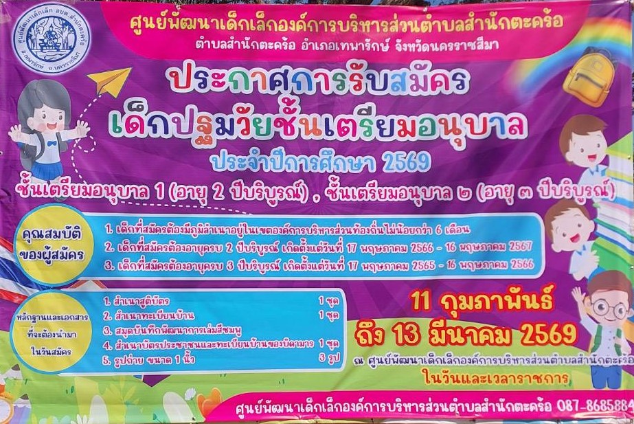 ศูนย์พัฒนาเด็กเล็กองค์การบริหารส่วนตำบลสำนักตะคร้อเปิดรับสมัครนักเรียนใหม่ประจำปีการศึกษา 2569 ในระดับชั้นเตรียมอนุบาล