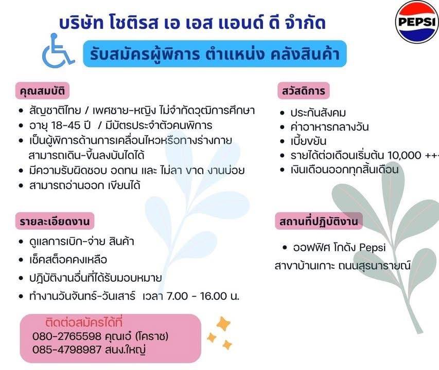 📣บริษัท โชติรส เอ เอส แอนด์ ดี จำกัด กำลังเปิดรับสมัครพนักงานหลายตำแหน่งสำหรับผู้พิการในคลังสินค้า โดยผู้ที่สนใจสามารถติดต่อสอบถามข้อมูลเพิ่มเติมได้ตามเอกสารที่แนบด้านล่างได้เลยค่ะ