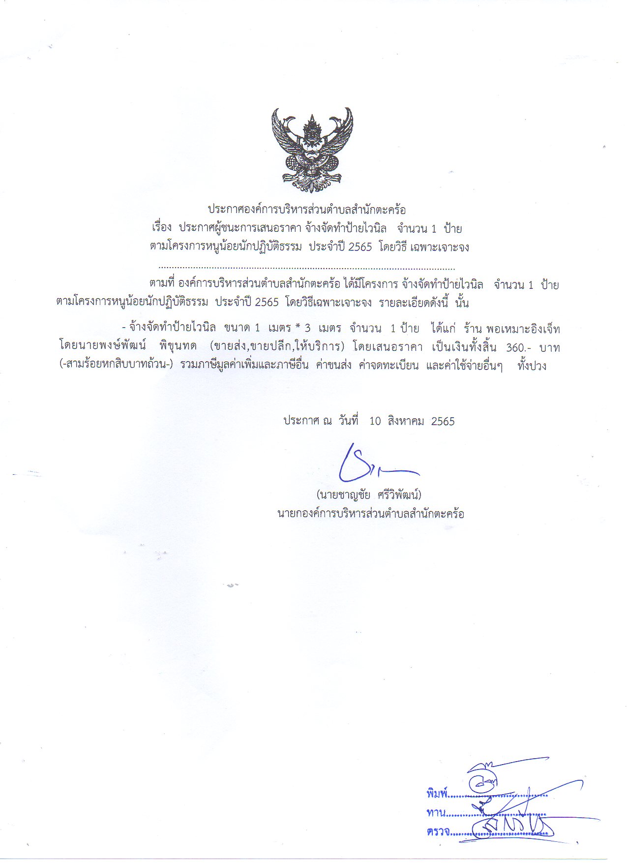 ประกาศผู้ชนะการเสนอราคา จ้างจัดทำป้ายไวนิลตามโครงการจัดการเลือกตั้งคณะผู้บริหารสมาชิกสภาฯ ในกรณีตำแหน่งว่างหรือเลือกตั้งใหม่ |